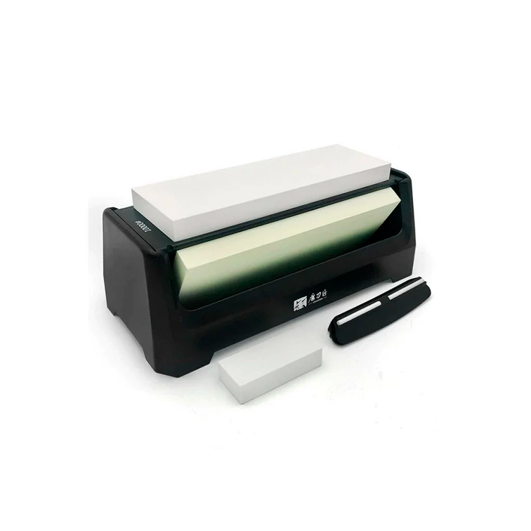 Base de afiar tripla, um conjunto com 3 pedras com gradações #2000, #6000 e #10000, com as quais você pode afiar perfeitamente qualquer faca.