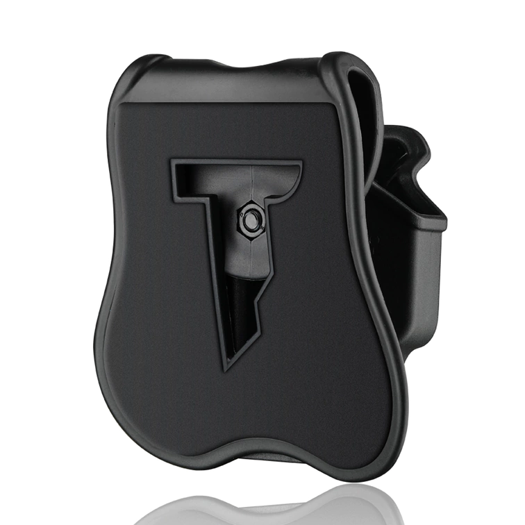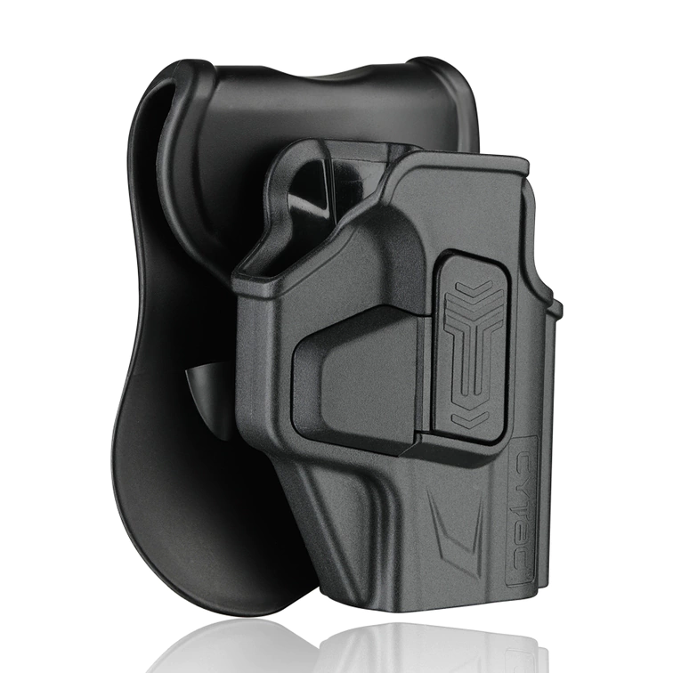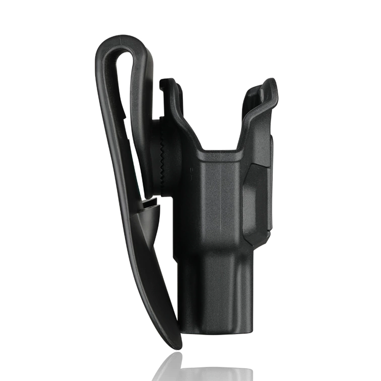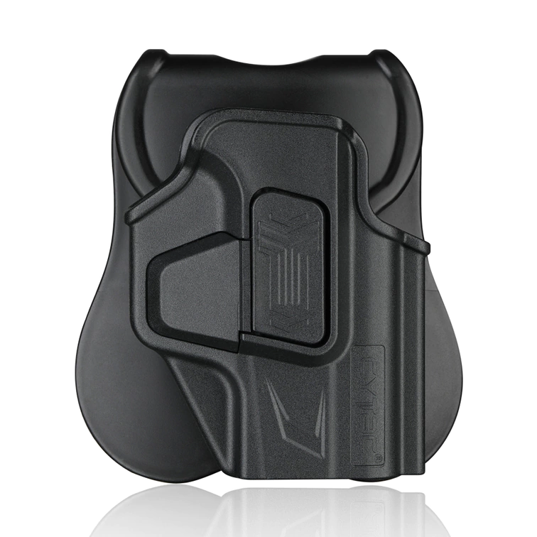 Possui botão de liberação pelo indicador e bloqueio rápido que permite o saque rápido e bloqueio automático quando a arma está fria