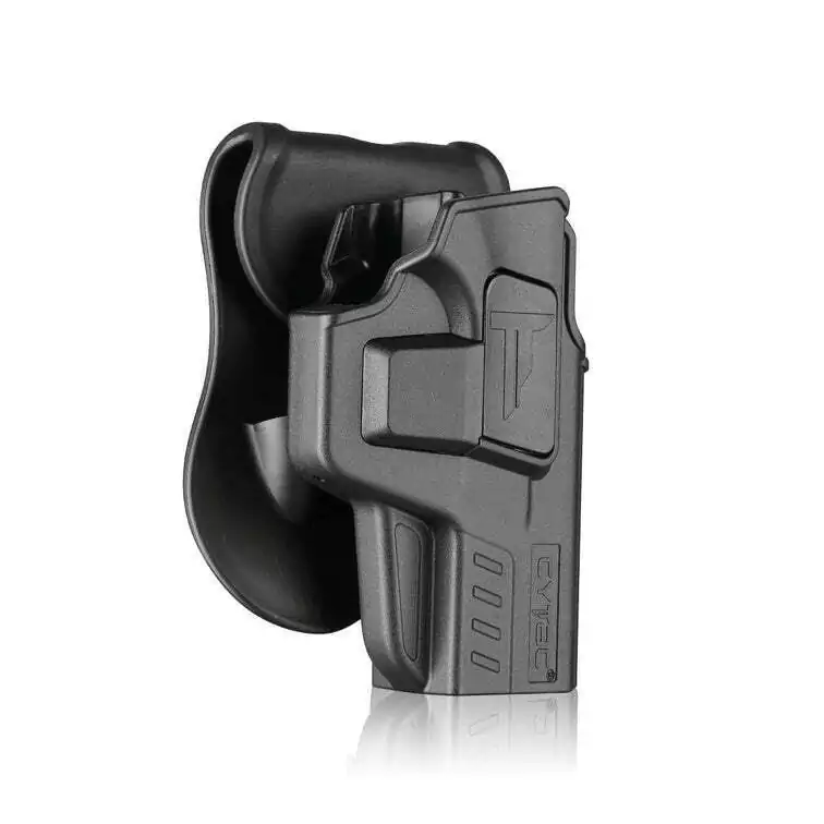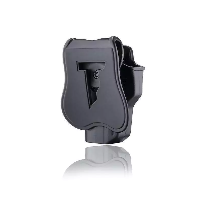O Coldre da Cytac possui um mecanismo de trava de segurança para saque rápido. Possui recorte que permite o uso com Miras Optrônicas acopladas.