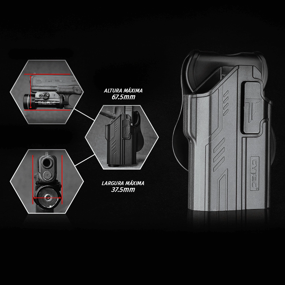 Compatibilidade de lanternas: Streamlight TLR-1 HL, Nightstick TCM-550XLS, Surefire X300U Ultra, Olight PL-1 II / PL-MINI / PL-MINI II, Sig Sauer FOXTROT1 , entre outras.
